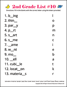 This spelling worksheet corresponds with our 2nd grade spelling list #10. Print it for your student so that he or she can enjoy some fun hands-on spelling activities. Directions: Fill in the blanks with the letters provided. This is an easy fill in the blank worksheet that all kids will have fun completing.